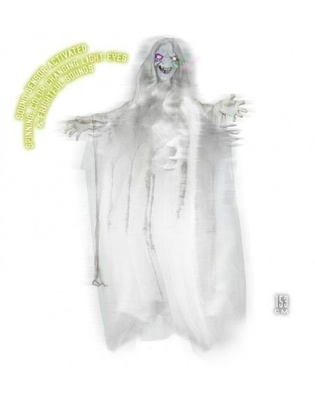 Bruja animada que gira con luz en los ojos que cambian de color y sonidos terroríficos, se activa con sensor sonido, con función "try me". Medida: 153 cm