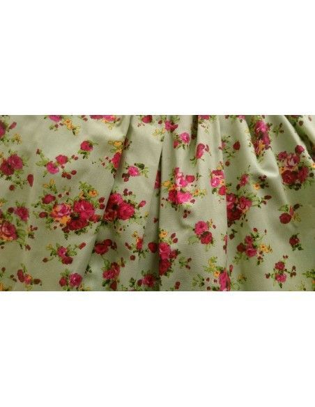 Disfraz de Pastora flores rosas deluxe. Incluye: falda con can can, delantal, camisa con chaleco y pañuelo de tela para la cabeza. Tejidos de alta calidad, confeccionado en nuestro propio taller, diseño exclusivo